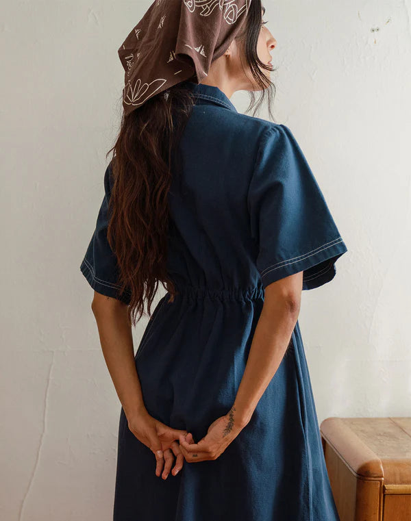 Noble's signature Utility Dress is now available in a longer length. This version also features a two-way zipper, oversized sleeves, a cinched elastic waist and full skirt for a flattering, comfortable fit.