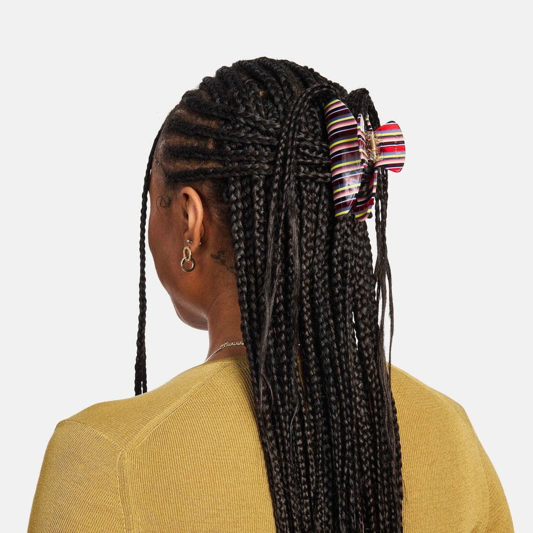 This medium sized hair claw is super versatile and works for all hair types and textures. Use for full twists or buns on fine to medium hair. Use for half updo's with medium to thick hair. Made from high quality acetate; a durable, plant based bio-plastic. Metal hardware is lead and nickel-free. Slight variations will appear with pattern, color and form due to the handmade nature of the product.