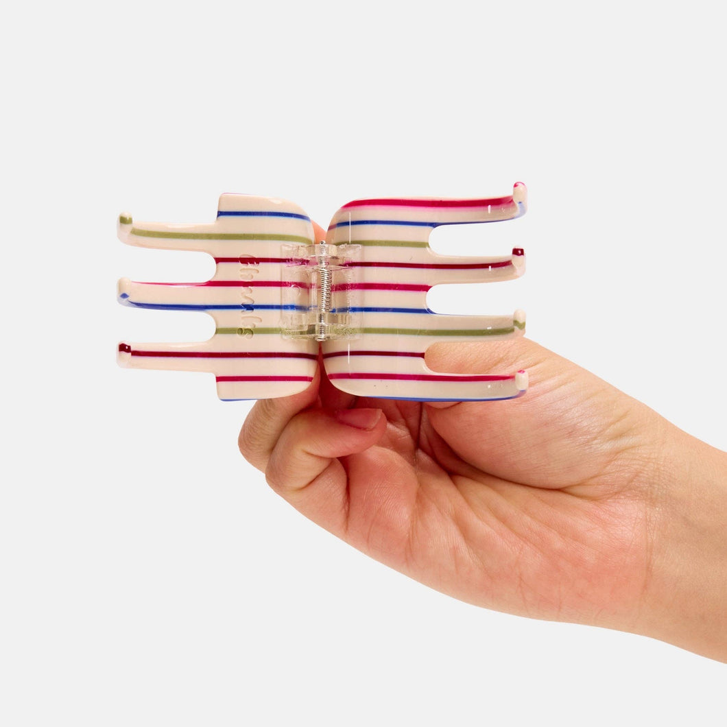 This medium sized claw is uniquely perfect for curly, textured, medium to thick hair. Large teeth give a gentle but firm hold, without crushing curls. Made from high quality acetate; a durable, plant based bio-plastic. Metal hardware is lead and nickel-free. Slight variations will appear with pattern, color and form due to the handmade nature of the product.
