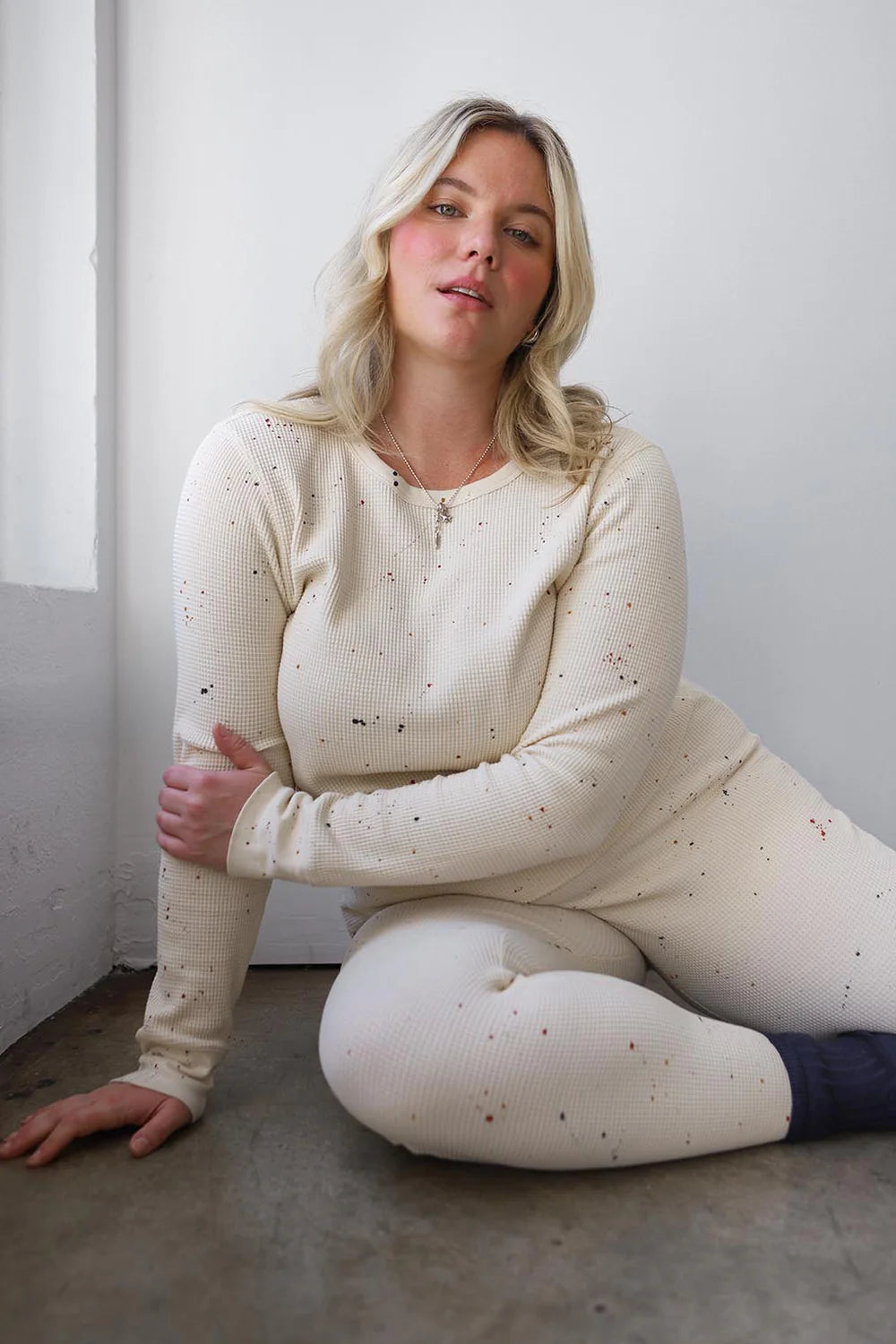 The Splatter print in Noble's Waffle Long-Sleeve Thermal Top made with 100% GOTS-certified organic pima cotton on our Oat Milk color way. Their luxurious waffle fabric is breathable, buttery soft, and durable, keeping you the perfect amount of cozy without overheating. They're perfect for everyday wear with jeans, worn as base layers in the winter, or paired with our waffle bottoms for bedtime.