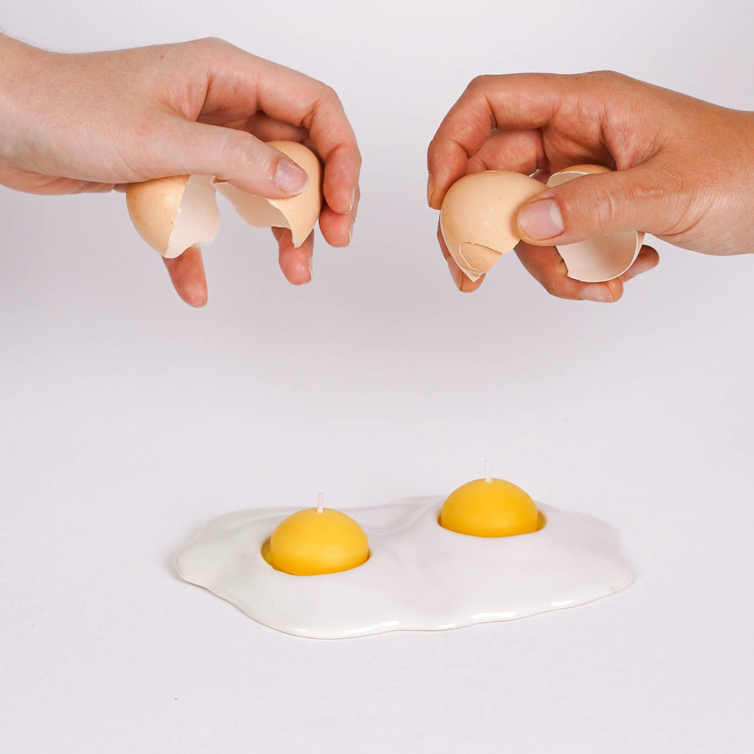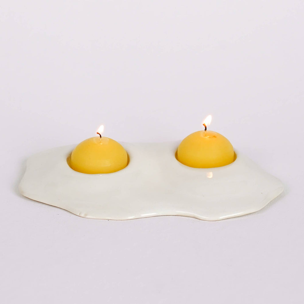 For the two-egg breakfast enthusiasts out there! These unique candle holders feature a handmade ceramic "egg white" base and two hand poured beeswax tea light "yolks". Pair with our single eggs and salt and pepper eggs for an eggcellent display. Approximate burn time: 4 hours.