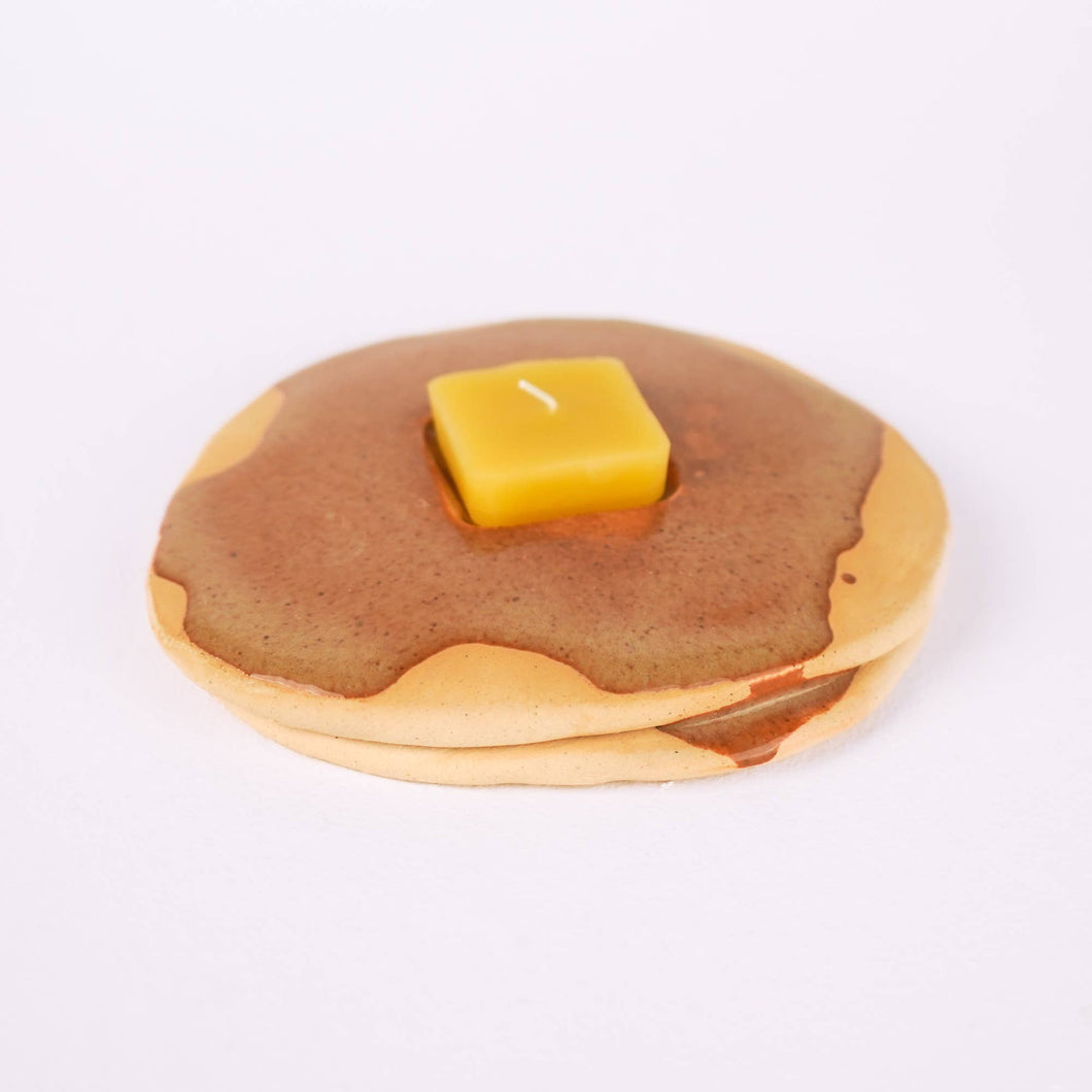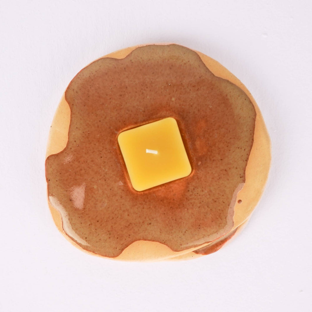 A short stack of pancakes, topped off with a "syrup" glaze and a hand poured beeswax tea light that resembles a pat of butter. Made by hand, each stack is unique!