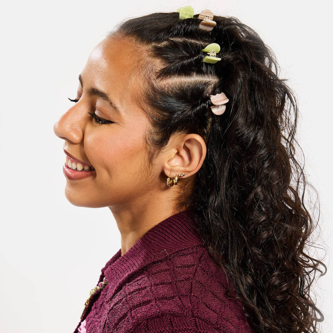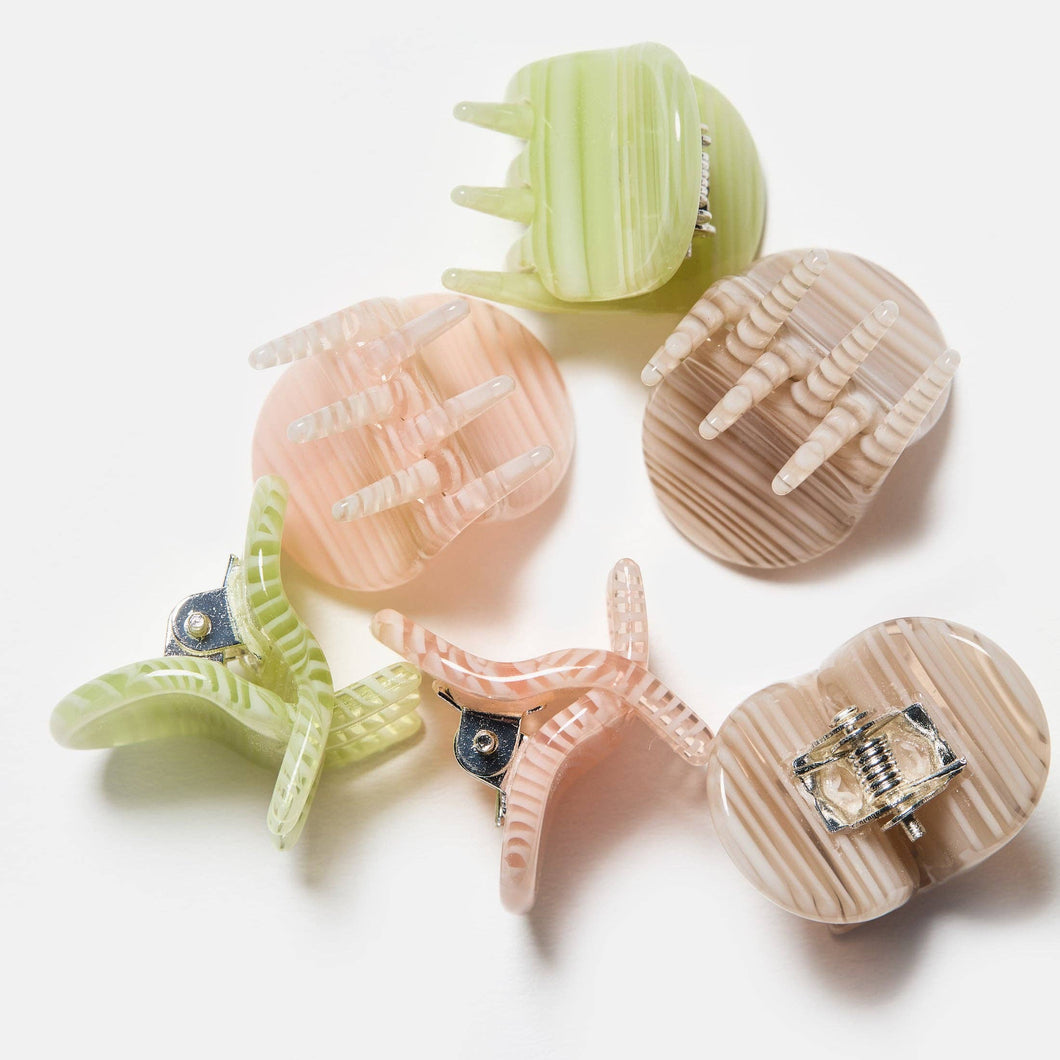 Six micro (but mighty!) claws, perfect for styling all hair types and textures. Made from high quality acetate; a durable, plant based bio-plastic. Metal hardware is lead and nickel-free. Slight variations will appear with pattern, color and form due to the handmade nature of the product.